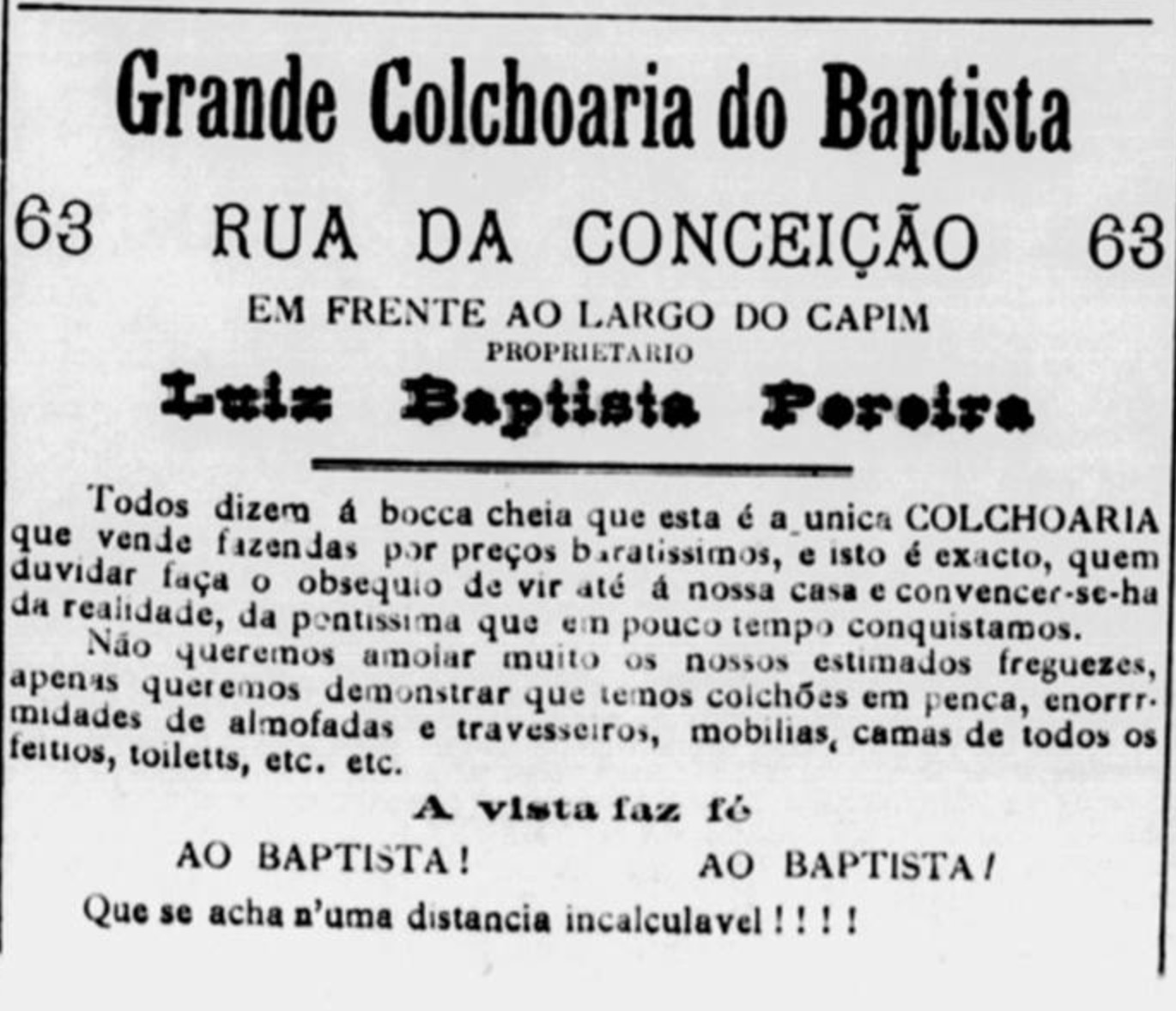 Anúncio de loja de colchões com todo o requinte da comunicação do final do século XIX. Eis a campanha da Grande Colchoaria do Baptista, localizado na cidade do Rio de Janeiro. O texto apresentava a linha de produtos ofertados, além dos aclamados colchões. Campanha veiculada no jornal O Fluminense na edição do dia 20 de maio de 1891.