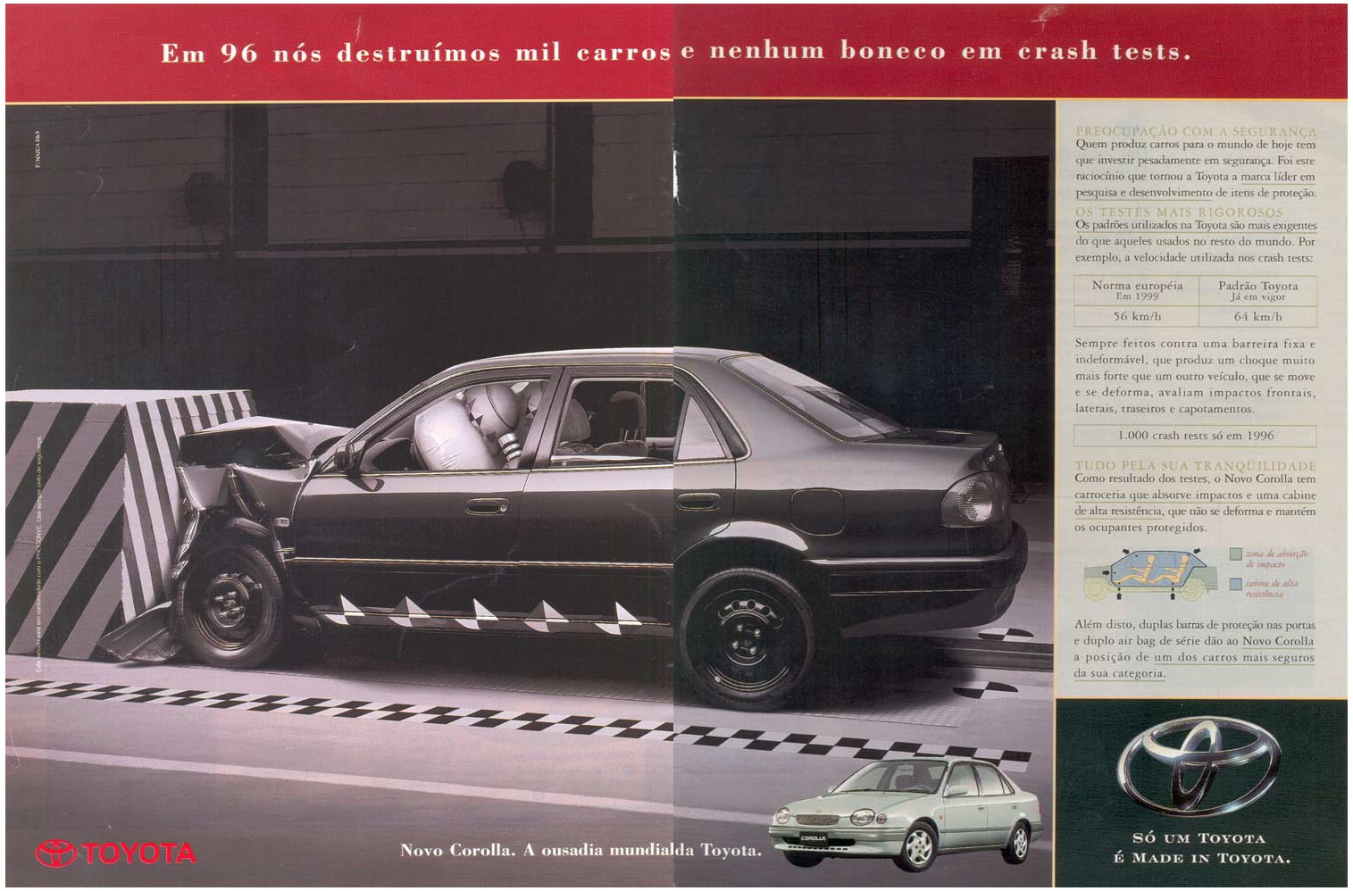 Esta propaganda do Toyota Corolla, veiculada na edição de 31 de dezembro de 1997 da Revista Super Interessante, destaca o foco da marca em segurança automotiva, utilizando crash tests como principal argumento. A frase de impacto "Em 96 nós destruímos mil carros e nenhum boneco em crash tests" ressalta a seriedade com que a Toyota tratava a segurança dos ocupantes. A imagem central mostra um carro em um teste de colisão, com airbags ativados, transmitindo visualmente a mensagem de proteção.